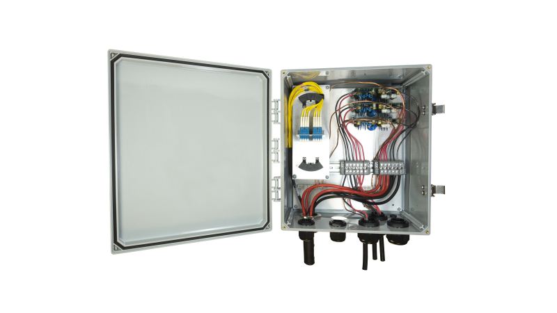 Amphenol的混合(電源和光纖)分界箱為室內或室外設備安裝提供了出色的保護。密封的聚合物外殼可提供長壽命的耐候性位置,以標記,組合或隔離光信號光纖和銅纜電源,以連接到各種通信設備,包括回程,宏和小型蜂窩無線應用。入口和出口可以配置為包括銅質電力電纜或光纖電纜。